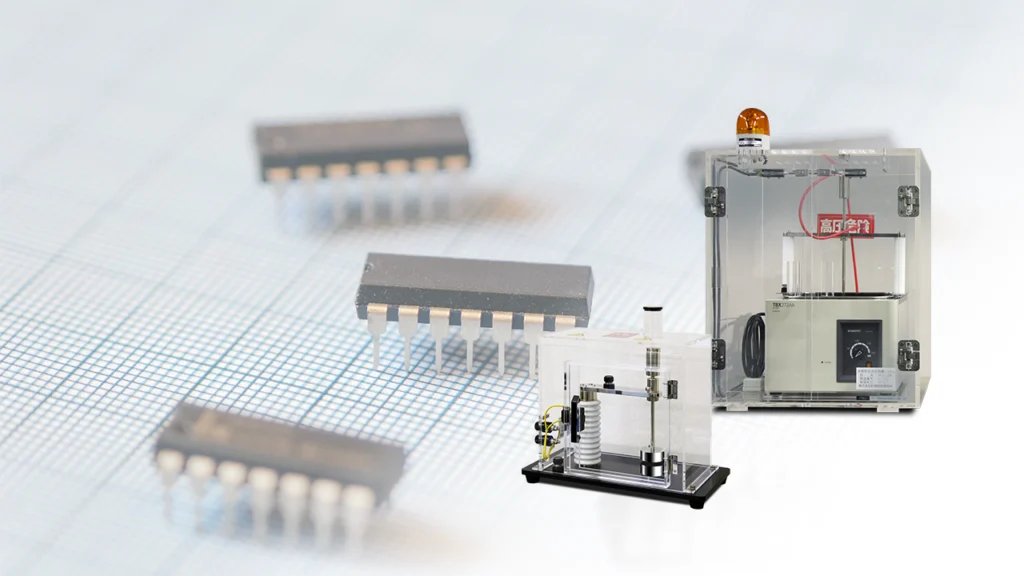 半導体の高耐電圧試験用途としてご利用いただける装置です。JIS C 2110に準拠した電極治具を搭載し、パワー半導体や半導体絶縁材料などのV-t試験にもご活用いただけます。