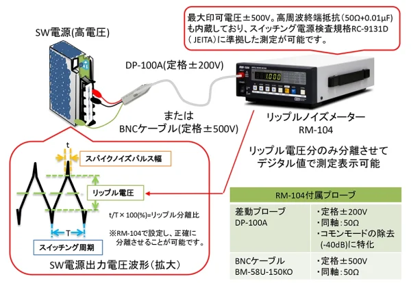 高電圧のリップルノイズを測定するには、オシロスコープの定格電圧を超えないように、高電圧対応の差動プローブが必要ですが、非常に高額です。一方で、リップルノイズメータRM-104を使用すれば、最大500VまでJEITA規格に準拠した方法で、誰でも簡単に安定した測定が可能です。