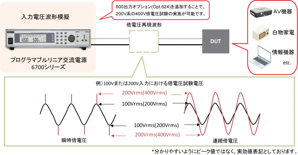 系統電圧の異常電圧でも、機器が正しく動作するか?評価する為、倍電圧試験が実施されております。規格試験ではなく各メーカ社内規定に基く試験方法です。100V、200V、ワールドワイド入力があり、それぞれ最大電圧の倍の電圧を短時間印加します。通常交流電源は最大でも310V出力しかなくトランス昇圧方式で試験しておりましたが、安定度が悪い欠点があります。6700シリーズの600V出力オプションを使うことで、交流電源の安定度そのままで、設定も簡単に試験することが可能です。