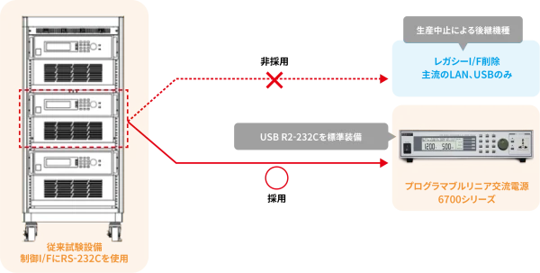 従来使用していた試験設備を新規に構築する場合、過去使っていた機器の生産中止品により、機器制御方法を変更せざるをえない事が発生する場合があります。特に古い試験設備などでは、レガシーI/FであるRS-232Cを使用していることが多くあり、最近主流であるLANやUSBに対応するには、制御ソフトを大幅に変更する為対応にコストアップにつながります。