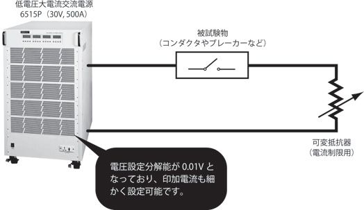 コンダクタ(開閉器)やブレーカーの試験では、大電流を流すことにより接触抵抗を測定する試験を行います。このような試験には定電流電源を使用したり、大容量交流電源と電流制限のための抵抗器を使用するのが一般的でしたが、導入コストが高額となります。当社ではこのような試験を想定した低電圧大電流交流電源を用意しております。これにより従来の方法よりも低価格で試験システムを構築することが可能となりました。