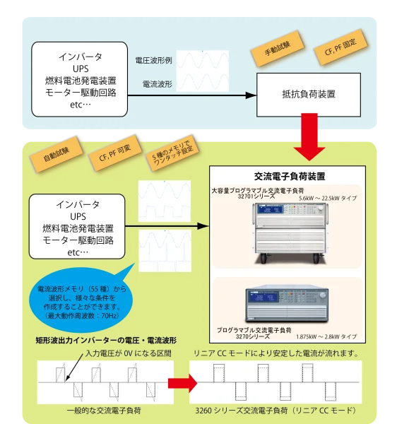 交流電子負荷装置は、インバータやUPS(無停電電源)の評価、さらに近年では燃料電池発電 装置の評価など様々な分野で使われています。評価試験の自動化、CF(クレストファクタ)及びPF(力率)の可変や様々な条件下での試験が可能となります。また、3260シリーズの新しいリニアCCモードにより矩形波出力インバータでも安定した試験が可能です。