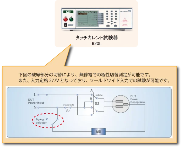 リーケージカレント(タッチカレント・漏れ電流)試験における無停電極性切換