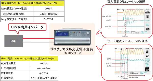 UPSや商用インバータの評価や試験において、突入電流試験を行う際は、実負荷の準備や試験回路などで再現させる為、準備や必要な突入電流値の設定に多くの時間がかかる試験項目でした。シミュレータ機能をもって交流電子負荷を用いることで、各種パラメータの設定により、要求する容量負荷性の突入電流や電源投入時のシミュレーションおよび電化製品へ直接電源を差し込んだサージ電流の再現を簡単に行うことができます。