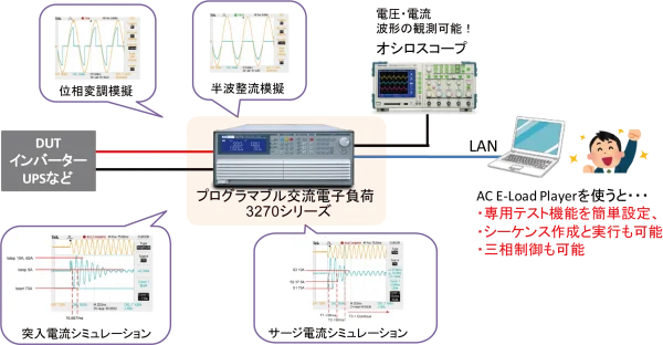 プログラマブル交流電子負荷3270/32701シリーズには電流シミュレーション機能が搭載され、位相変調、半波整流、突入・サージ電流シミュレーションなど様々な模擬が本体で設定可能です。専用ソフトAC E-Load Playerでは、PCベースで様々な電流シミュレーションの設定が可能です。