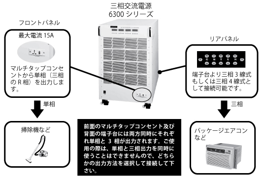 6300 シリーズ交流電源は、三相交流電源となっていますが、フロントパネルのマルチタップコンセントから単相出力、リアパネルの端子台から3相をそれぞれ出力することができます。特別な切り替えを行わずに単相及び3相の出力が可能となっており、被試験物の電源入力形式に合わせて簡単に接続することができます。