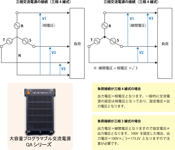 現在普及している三相交流電源は三相4線式で出力するものが多く、各相の出力(R, S, T)とは別にニュートラル(N)端子を持っているのが一般的です。三相4線式の交流電源は、負荷となる供試物の入力形態にあわせ、三相3線式(R,S,T)でも接続可能です。ただし、出力電圧の設定は、基本的に「相電圧」での設定となりますので、3線式での「線間電圧」とは異なるため注意が必要です。