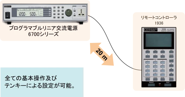 交流電源を隣室に置き、遠隔操作したい場合インターフェースが必要となりますが、広く普及している計測器用インターフェース(IEEE488)はケーブル長2mを規定しており、特殊な方法を用いない限り対応できません。また、RS-232Cは10m程度まで延長可能ですが、コントロール用PCと専用のソフトウェアを作成することが必要となります。