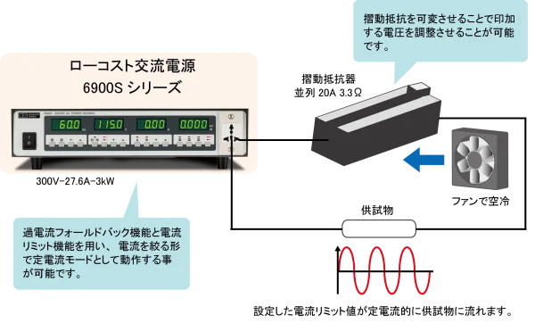 一般的に交流電源は定電圧源として動作しますが、6000シリーズでは外部に抵抗負荷を接続し過電流フォールドバック機能と電流リミット動作をさせることで、ソフトウェア的に定電流動作が可能です。リミット電流は最小0.01Aから設定することができます。 20A程度であれば、市販の抵抗負荷と組み合わせることでお手軽に定電流源として動作することができます。