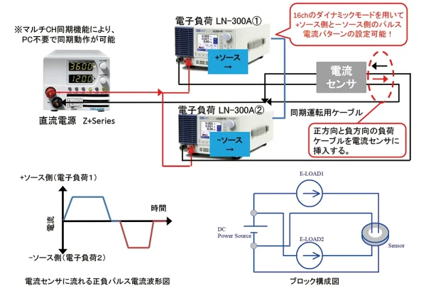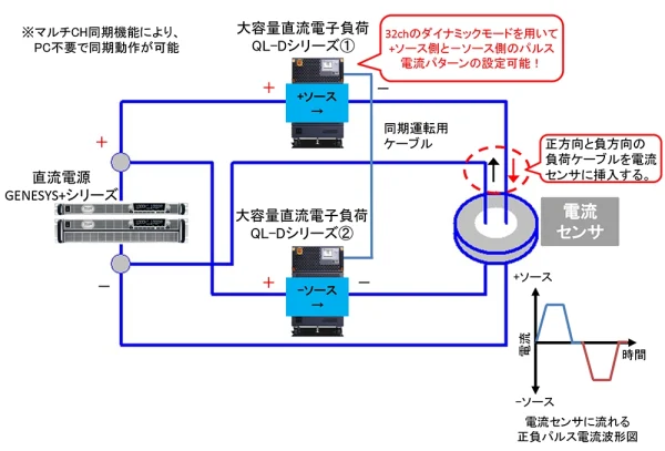 車載用の大電流検出用電流センサには、短時間でのダイナミックな電流変動に対応する応答性が求められます。評価には双方向性が必要ですが、高速バイポーラ電源では対応が難しい。そこで、汎用の直流電源と同期運転可能な大電流電子負荷を2台用いることで、正負の大電流パルスを再現可能となり、PC不要で同期動作が可能となります。これにより、大電流センサの評価が実現できます。