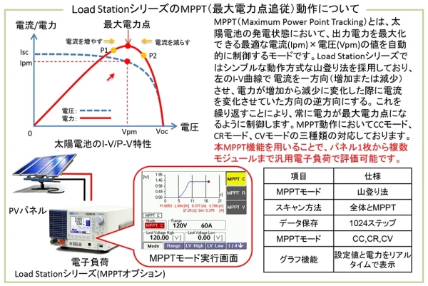 ペロブスカイト太陽電池は「曲げられる」「薄い・軽い」「低コスト」といった特長から小型化が進んでおり、1枚あたりの発電量は少なくなっています。そのため、低出力に対応するMPPT機能付きの電源機器が必要です。電子負荷装置「Load Stationシリーズ」は、MPPTモードに対応可能で、CVモードにより微小電流で最大電力を追従でき、長期運転評価や暴露試験に適しています。