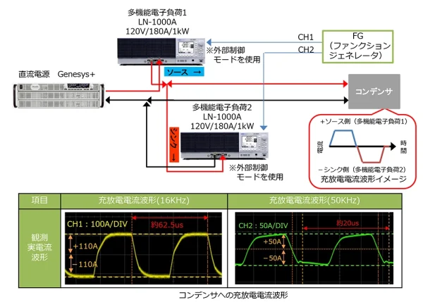 これに対し、電子負荷の外部制御とファンクションジェネレータによる同期運転を用いることで、シンク・ソースの高速切り替えによる大電流充放電が可能になります。