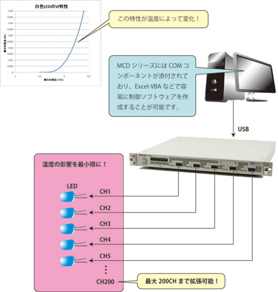LEDは周囲温度の変化によってその特性が変化します。このようなLEDのV-I特性を計測する場合、温度変化の影響を受けないよう、高速に測定することが必要となります。MCD-05シリーズは、5チャンネルの絶縁電源を内蔵しており、最小3msecの高速測定が可能となっておりますのでLEDのV-I特性を高速に取得することが可能です。