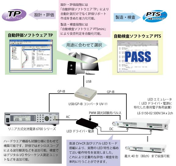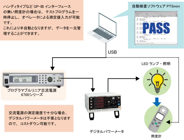自動検査ソフトウェアPTSminiによるLEDランプ、照明機器の自動検査システム構築例をご紹介します。スイッチング電源用自動検査ソフトウェアとして実績のあるPTSminiを使用し、 交流電源により入力電圧、周波数設定を行い、入力電圧、電力、電流、力率の測定及び照度の測定を自動化することが可能です。
