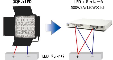 近年のパワーLEDの普及にともない、水銀灯やHIDランプのような高出力照明もLED化が進んでおります。当社の2チャンネルLEDエミュレータLE-5150-02は、150Wの2チャンネルを並列接続することにより300Wとして使用することができますので、水銀灯やHIDランプの代替えLEDを点灯するドライバの試験にも使用することができます。