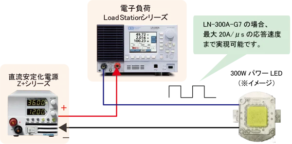 このアプリでは、直流電源と電子負荷を組合せてパワーLEDをパルス的に高速点滅する試験方法をご紹介します。直流電源のみでは高速に点滅させることはできませんが、直流電源の出力に高速応答の電子負荷を挿入することにより、専用の試験装置を用意することなく比較的容易に実現することができます。