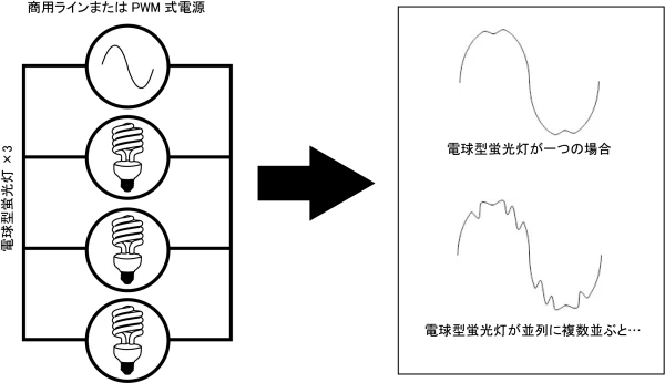 リニアタイプの交流電源を供給側に使用することで、波形歪に強く安定した交流出力源となりますので、電球型蛍光灯の安定した照度評価に使用することができます。