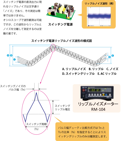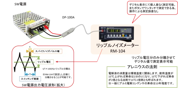 リップルノイズメーターRM-104はオシロスコープを使うことなく、簡単にリップル電圧を分離し測定できる為、複雑な操作や個人差による測定誤差なく、SW電源の寿命判定基準となるリップル電圧を測定することが可能です。