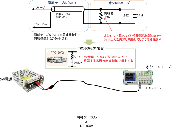 オシロスコープでリップルノイズ測定する場合、入力抵抗を1MΩから50Ωにインピーダンス整合する必要があります。ただしオシロに内蔵されている抵抗器は0.5W程度しかなく5V以上の電圧を測定した場合、抵抗器が焼損しオシロが破損してしまうことがあります。