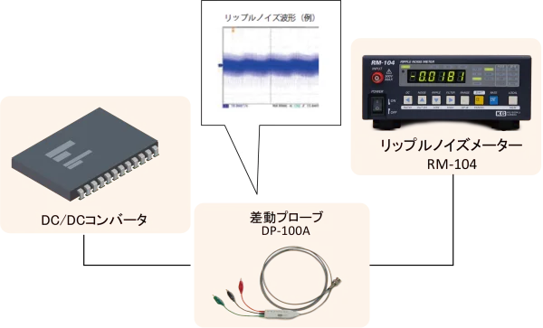 高電圧のリップルノイズを測定するには、オシロスコープの定格電圧を超えないように、高電圧対応の差動プローブが必要ですが、非常に高額です。一方で、リップルノイズメータRM-104を使用すれば、最大500VまでJEITA規格に準拠した方法で、誰でも簡単に安定した測定が可能です。
