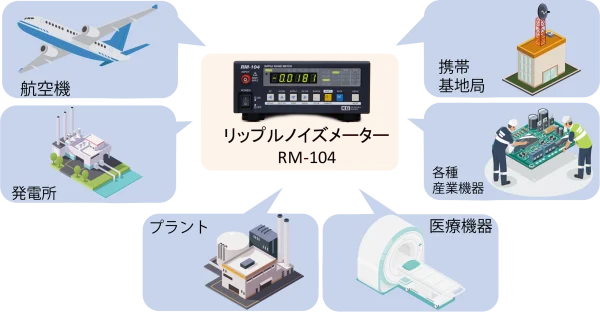 シビアな運用が求められる発電所や航空機などのメンテナンス現場ではスイッチング電源のリップル電圧を測定することにより電源内部に実装されている有寿命部品(アルミ電解コンデンサ)の劣化を想定して交換時期が決められており、平滑能力低下の指標としてリップル電圧をワンタッチ測定できるリップルノイズメータが使われています。