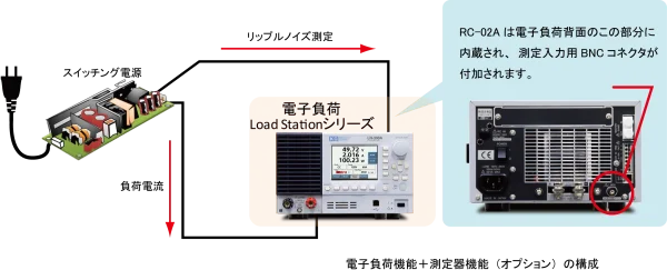 スイッチング電源の出力に現れるリップルノイズ電圧の測定はリップルノイズメータにより容易に測定することができますが、リップルノイズ測定時にはスイッチング電源の出力に流す電流値を無負荷、定格負荷など、いくつかの条件で試験することが必要です。