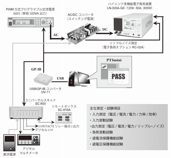小規模AC/DCコンバータ試験(基本検査例1)にOVP(過電圧保護)の機能試験を追加したものです。ユニバーサルスキャナSC-800、OVスキャナSC-820及び市販の直流電源を追加することにより可能となります。
