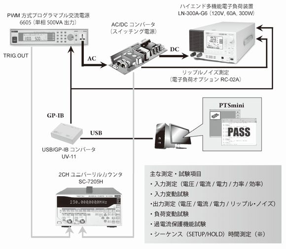 アプリNo.112:小規模AC/DCコンバータ試験(基本検査例1)にシーケンス(SETUP/HOLD 時間)の試験機能を追加したものをご紹介致します。