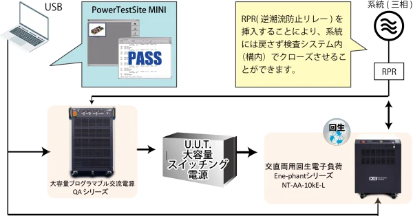 このアプリでは、交直両用回生電子負荷装置Ene-phantシリーズを使った、大容量スイッチング電源の試験についてご紹介します。大容量スイッチング電源の試験を行う場合、言うまでもなく入力側の交流電源や出力側の電子負荷も大容量の機種が必要となりますが、出力側の電子負荷に回生タイプを使用することにより試験に必要なトータルの消費電力を低く抑えることができます。