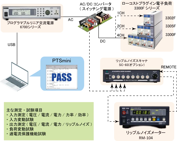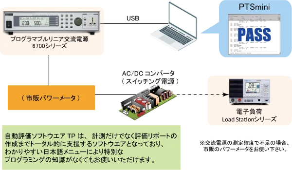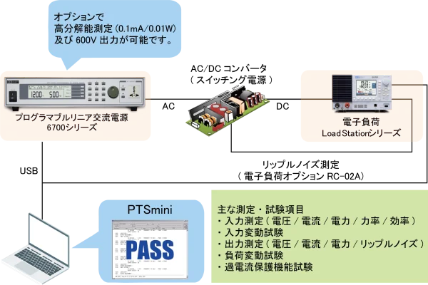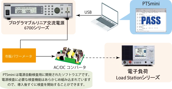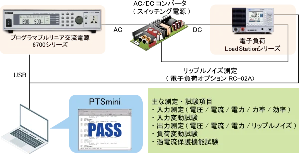 PW-600E電源自動検査システムを使うとスイッチング電源の検査を最小限の労力で短期間に 立ち上げることができます。AC/DCコンバータの場合は交流電源model-602Aと負荷・測定ユニットmodel-600 の2台だけで自動検査システムが完成します。さらに専用ソフトウェアのPowerTestSiteにより検査プログラム作成も短時間で可能です。