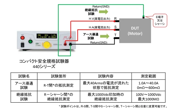 モーターなどの巻き線抵抗や絶縁抵抗が測定可能な安全規格試験器