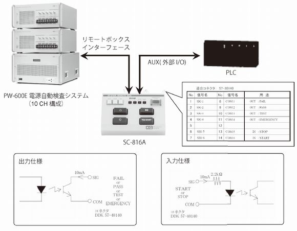 スイッチング電源自動検査システムPW-600EのリモートボックスSC-816AのAUX(外部I/O)コネクタを使ったPLCとの接続例をご紹介します。これにより検査の開始・終了や検査判定結 果等をPLCとインターフェースすることが可能となります。