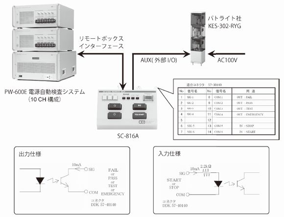 スイッチング電源自動検査システムPW-600EのリモートボックスSC-816AのAUX(外部I/O)コネクタを使ったパトライトとの接続例をご紹介します。これにより検査結果(PASS/FAIL)等によってパトライトを点灯することが可能となります。