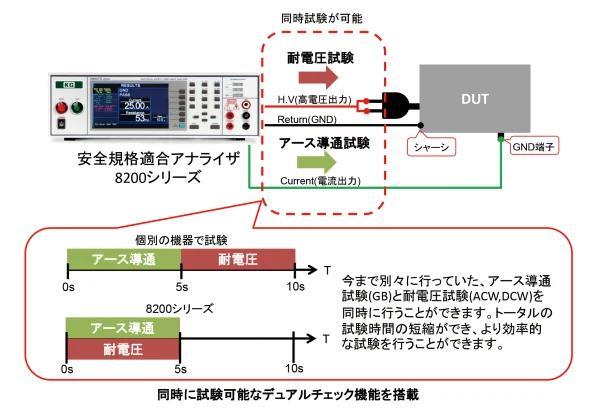 アース導通(GB)と耐電圧(ACW,DCW)を同時に試験可能な安全試験器