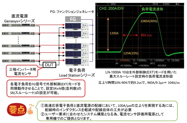 複数の高速応答電子負荷を外部制御(EXT)モードで同期運転させることにより、1000A以上の大電流で電流センサの電流応答を評価できます。実験例として、LN-1000Aを10台使用した場合、1200Aの負荷電流において100A/μsの立ち上がり時間での電流応答が可能となり、次世代電流センサなどの評価に使用できるアプリケーションとなります。