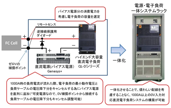 燃料電池セルの大電流化に伴い、1000A以上の大電流試験が増加しています。燃料電池セルは低電圧で発電するため、通常の電子負荷では試験が難しい状況です。そこで、バイアス電源を直列に接続して、負荷装置の最小動作電圧やケーブルの電圧降下を補正することで、0V入力対応の直流電子負荷システムを構築し、大電流試験に対応しています。