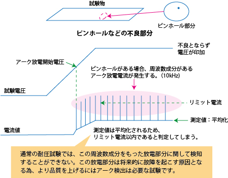 当社の7000 シリーズは、ほとんどのモデルにアーク放電検出機能が装備されており、通常の耐圧試験中では検出できない絶縁ケーブルのピンホールやPC基板上のパターン間不良について、10kHzのパルス状のアーク放電電流を測定し判定することができますので、より厳しい試験が可能となります。