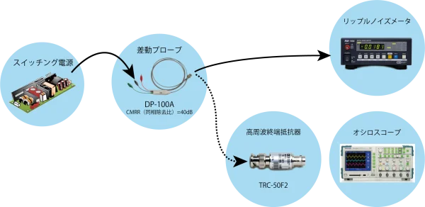 スイッチング電源の出力には複数のノイズ成分が含まれており、測定方法によっては全く異なる結果になることがあります。従って、リップルノイズメータやオシロスコープ等で測定する場合は注意が必要ですが、次のような点に注意して測定すれば、より正確な測定結果を得ることができます。