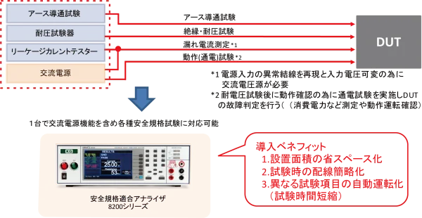 電気用品の安全試験は各種規格で定められており試験自体は比較的単純です。しかし試験に合わせて各種安全試験器の準備と、耐電圧試験は破壊試験に近い為、試験後の動作確認で交流電源やパワーメータの測定器が必要となり、複数台の試験器 […]