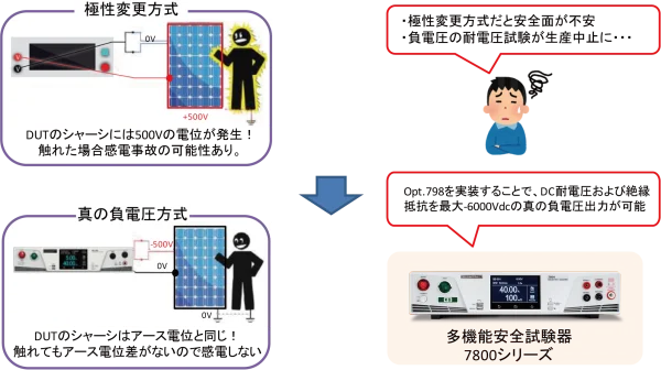 安全試験の規格試験において負電圧の試験が必要な場合があります。従来極性を変更して試験することが可能ですが、一般的な耐電圧試験器は正出力である為、極性変更して使用した際、DUTのシャーシ側(グランド電位)が高圧部となる為、シャーシに触れた場合感電する可能性があり事故につながります。