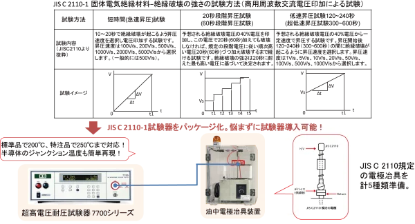 絶縁材料として固体電気絶縁材料がありますが、それぞれ材料毎に絶縁耐力試験に関する記載はなく、日本ではJIS C 2110に包括され試験方法が規定されております。商用交流周波数を用いた方法が一般的であり、JIS C 2110-1に記載されております。様々な試験条件がありますが、パッケージ化された試験器を採用することで悩むことなく。JIS C 2110-1の試験を実施することが可能です。