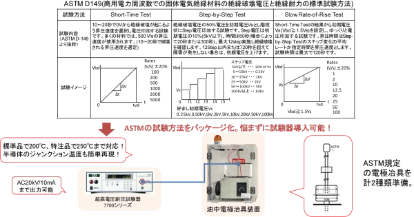 絶縁材料として固体電気絶縁材料の絶縁耐力試験方法は、JIS C2110-1以外にASTM D149に包括され試験方法が規定されております。ASTM は、米国における工業材料や試験方法に関する規格で任意規格でありながら、世界各国で法規制などの基準とされるなど、国際的に広く通用しています。