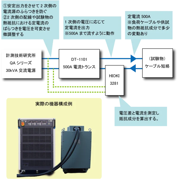 中国CCCでは、医用電気機器の安全規格GB9706.1では、実際の消費電流ではなくブレーカの遮断電流に対して1.5倍の電流によるアース導通試験が要求されています。このような場合、一般的なアース導通試験では最大電流が不足することがあります。そこで、以下のように定電圧交流電源と電流トランスの組み合わせにより大電流のアース導通試験を実現した例をご紹介します。