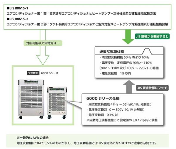 このアプリケーションでは、JIS B8615-1(B8615-2)や(社)日本冷凍空調工業会で規定されているルームエアコンおよびパッケージエアコンの運転試験方法で規定されている供給電源能力に準拠した交流電源についてご紹介します。
