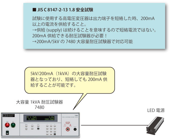 JIS C 8147-2-13で規定されているLED電源の安全試験方法について、試験方法自体は一般的な耐圧試験器による方法と変わりませんが、耐圧試験器の出力電流容量について出力短絡時に200mA以上供給する要求があります。このアプリケーションでは、JIS C 8147-2-13規格に対応した安全試験器をご紹介します。
