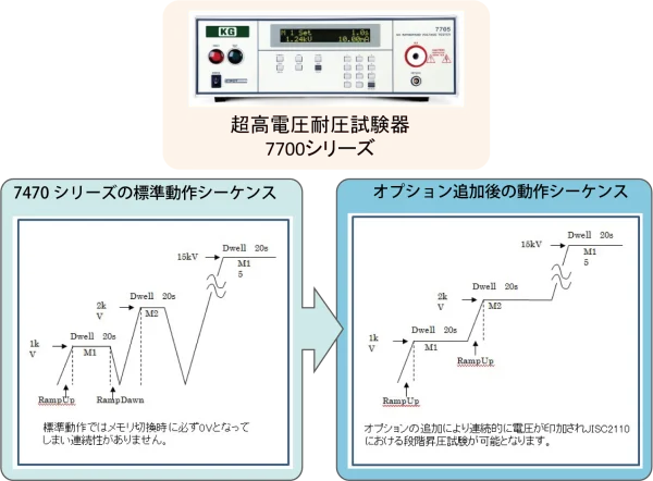JIS C2110では、段階昇圧試験の要求事項として連続的に電圧を印加することが必要です。当社の超高電圧耐圧試験器7700シリーズはオプションを追加することによって段階昇圧試験を連続的に実施することが可能です。(オプショ […]