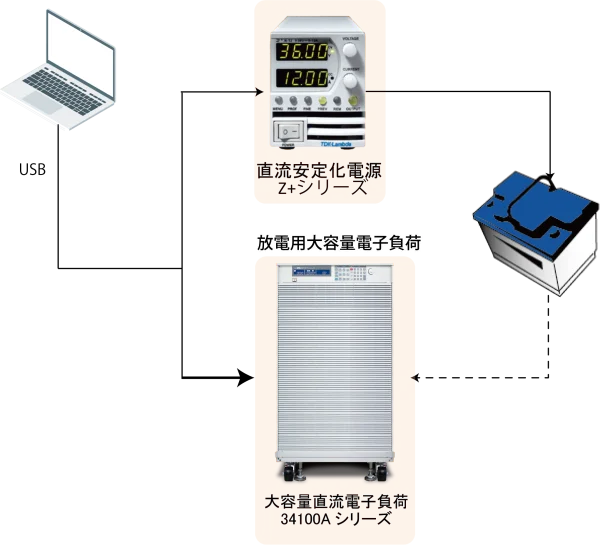 充電用の汎用直流電源と、放電用の大容量直流電子負荷装置を組み合わせ、コントロール用PCにより自動制御することにより、容易に充放電試験を実現することができます。