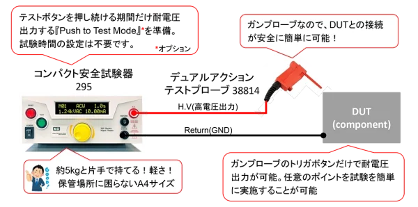 ガンタイプのテストプローブは、トリガボタンを押さない限り電極が露出しない安全な構造で、DUTとの安全な接触が可能です。これにより、耐電圧試験を安全かつ直感的に実施でき、複数ポイントでの絶縁耐力の測定が容易になります。