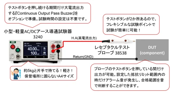 従来のアース導通試験は手間と時間がかかっていましたが、小型・軽量の試験器『3240』は、オプションの追加により、ボタンを押している間だけ電流を出力し、設定範囲内でのみアラーム音を鳴らすことで、音で合格を判断できます。これにより、複数のポイントを直感的に試験することが可能になります。