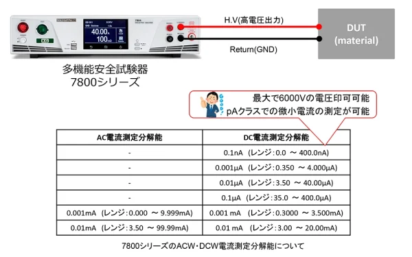 一般的なDC耐電圧試験器は微小電流の測定に限界がある一方、「7800シリーズ」は最大6000Vの出力と0.1nAの分解能で、精密な絶縁性の評価や検査が可能です。